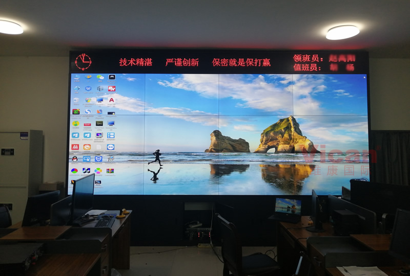 維康國際為河南某部隊提供的這套會議大屏,采用3行4列、55寸液晶拼接屏,產品性能穩定,超窄邊設計,雙邊拼縫僅有0.88mm,如上圖所示,有著很好的畫面一體化顯示效果。