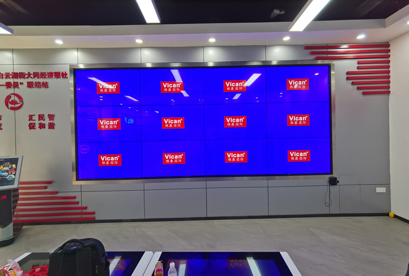 本案例中,是維康國際為廣州大崗村委提供的一套觸摸顯示屏,由3行4列、55寸液晶拼接屏,搭配紅外觸摸逛組成,如上圖所示。