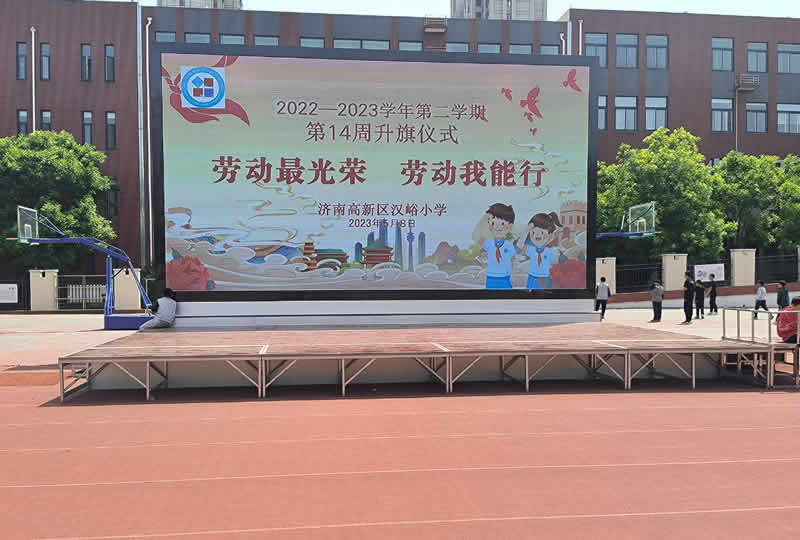 本案例中,維康國際為濟南市高新區某小學提供一套戶外舞臺LED顯示屏, 如上圖所示,超大屏幕顯示,大屏幕畫面一體化效果好,在強烈陽光下,畫面十分清晰亮麗。