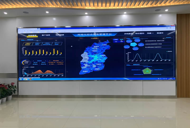 該案例,是維康國際為國家電網-太原河西營業廳安裝了一套大數據顯示屏系統,這套系統主要由3x5/55寸0.88mm液晶拼接屏組成。我們可以從上圖看到,大屏畫面清晰亮麗,超小縫隙拼接,有著很好的視覺體驗效果。