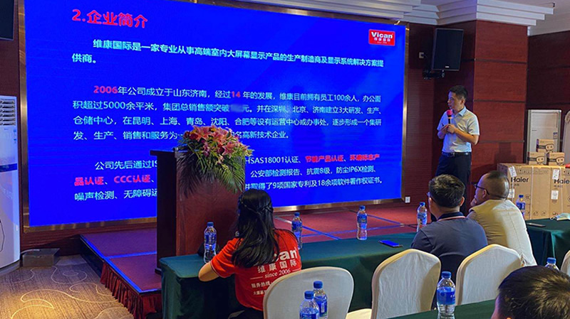 會議開始,索特公司許總對本次發(fā)布會到場的嘉賓及廣大朋友致以熱烈的歡迎,維康國際集團總裁曹有軍先生與大家一起回顧了維康國際的成長之路,并對維康國際的公司實力、未來的發(fā)展進行了詳細的介紹,并表明維康國際將進一步拓展在拼接屏、商顯等大屏顯示行業(yè)中的版圖,以更完善的服務(wù),提高品牌的知名度,讓更多的客戶認可接受我們的產(chǎn)品,相信通過與廣大合作伙伴的共同攜手前行,必將在大屏市場上再創(chuàng)佳績,共贏未來。