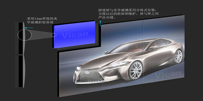 1、第三代無縫液晶拼接墻的技術原理是采用BFT技術和高分子的透明玻璃與原有的液晶拼接屏進行封裝,通過光的折射原理實現0mm拼縫顯示。