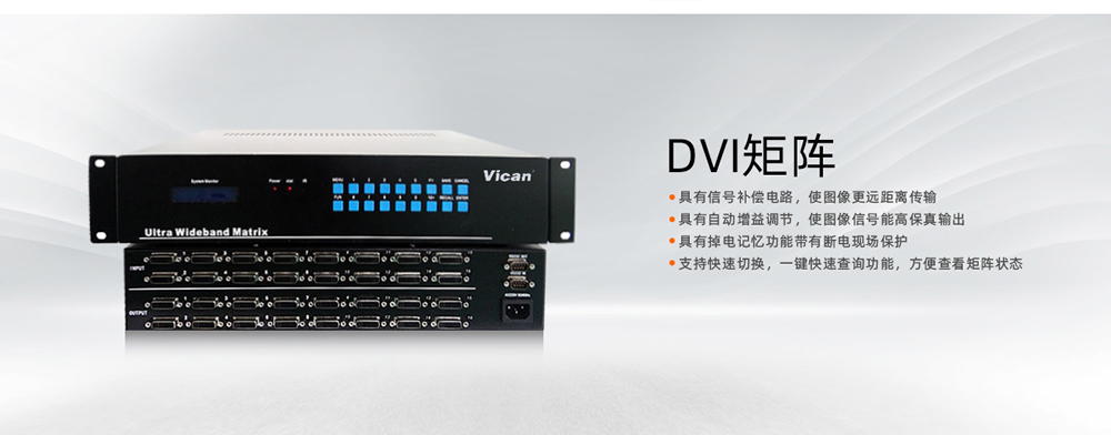 DVI矩陣JZ1000系列是專用于DVI高清2K信號輸入與輸出的控制設備,其特點與HDMI信號相同,都是高清信號控制系統,包含4進4出、4進8出、4進16出、8進8出、8進16出等;