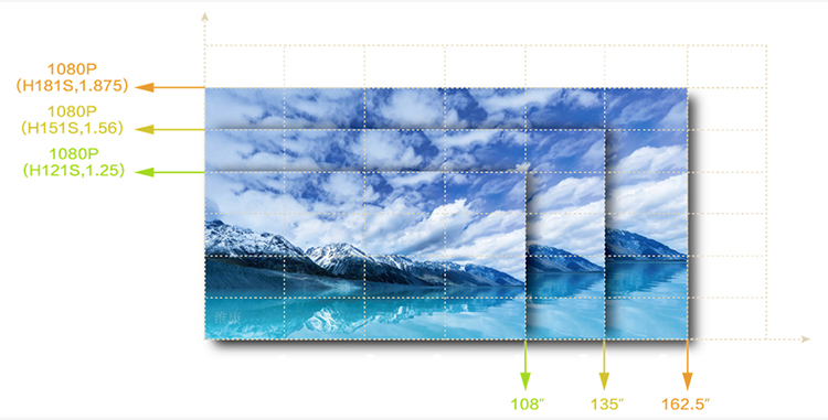 由于箱體是16:9比例,所以在拼接時(shí)只要保證等比例數(shù)量的拼接,整個(gè)LED顯示屏就不會(huì)發(fā)生變形,從而保證整體的顯示效果。如下圖,P1.2小間距l(xiāng)ed顯示屏通過4*4共16個(gè)箱體拼接即可實(shí)現(xiàn)1080P分辨率顯示;P1.5的則可以通過5*5拼接,P1.8的則通過6*6拼接。