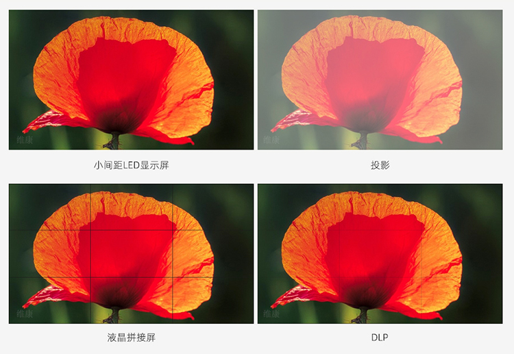 以下為小間距l(xiāng)ed顯示屏、投影、液晶拼接屏、DLP四種主流的大屏顯示技術(shù)的效果對(duì)比,通過對(duì)比可以看到投影由于對(duì)比度低導(dǎo)致屏幕發(fā)白,而液晶拼接屏與DLP都有不同程度的拼縫,P1.2小間距l(xiāng)ed顯示屏由于點(diǎn)間距只有1.2毫米,所以即沒有拼縫而且分辨率也有保證。