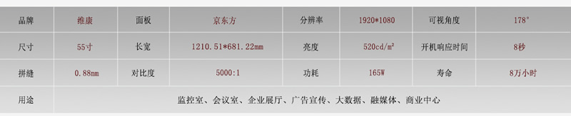 京東方簡稱BOE,是知名的液晶面板制造商,提供大尺寸液晶面板、小尺寸手機屏等,在液晶拼接屏產品線中,尺寸及拼縫規格齊全。面板采用16:9比例,低能耗,待機功率只有0.5W。