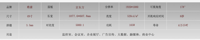 京東方49寸拼接屏目前只有一款3.5mm拼縫規格,而且是拼接后的寬度,3.5mm也是當前拼接屏拼縫規格中主流的一款,拼縫適中,在各種場合都可以使用。
