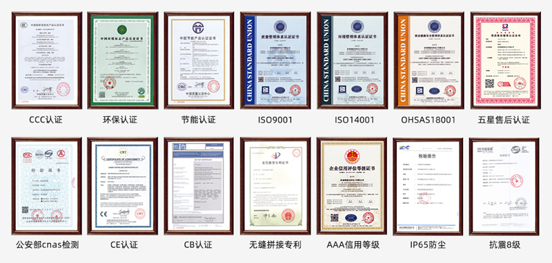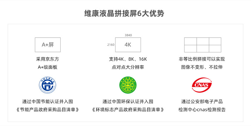 維康國際通過了ISO9001質量管理體系、ISO14001、OHSAS18001、3C、節能認證、環保認證、公安部cnas檢測報告、抗震8級、防塵、CE、CB、FCC、ROHS、外觀專利、大屏軟件專利等,在支持客戶參與招投標項目中有很大優勢。