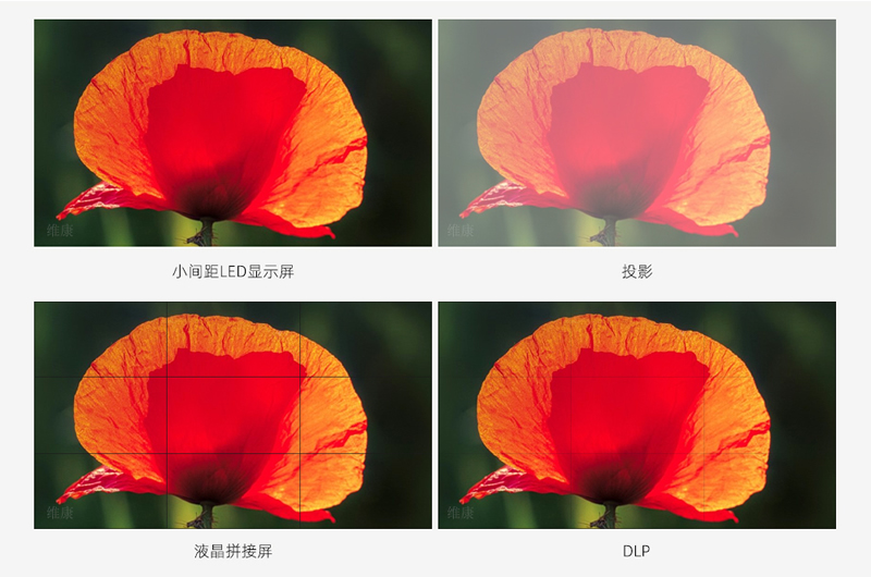 以下是小間距l(xiāng)ed顯示屏、投影、液晶拼接屏、DLP四種主流的大屏顯示技術(shù)的效果對比,通過對比可以看到投影由于對比度低導(dǎo)致屏幕發(fā)白,而液晶拼接屏與DLP大屏都有不同程度的拼縫,而led顯示屏由于點(diǎn)間距只有1.25毫米,所以即沒有拼縫而且分辨率也有保證。