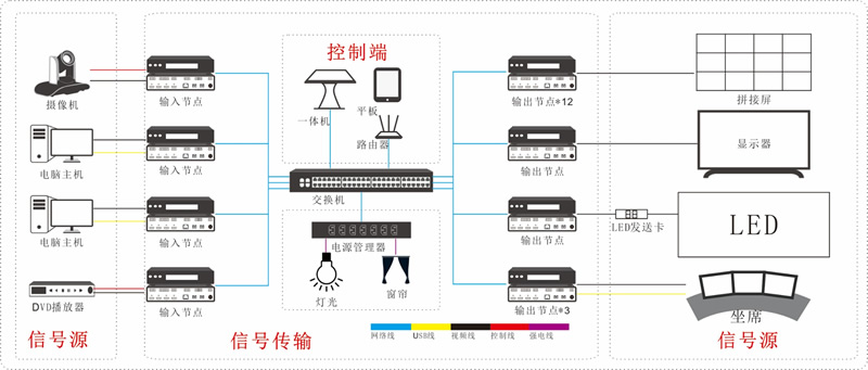 系統(tǒng)將音視頻采集、傳輸、控制和顯示都通過數(shù)字化網(wǎng)絡(luò)連接起來。采用集中式處理、網(wǎng)絡(luò)式控制架構(gòu),同時(shí)可以把地理上分散的各節(jié)點(diǎn)統(tǒng)一控制管理起來。并且具備極大地的靈活性和擴(kuò)展性,支持音視頻信號多點(diǎn)共享,移動(dòng)終端預(yù)覽控制、音視頻網(wǎng)絡(luò)交互式通信等功能。