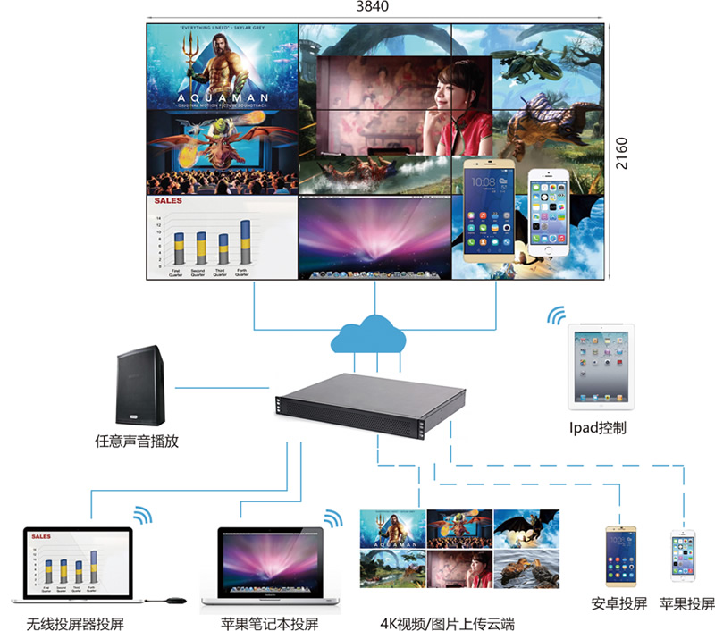 無需任何輸入,4K“融媒體”處理器拼接播放可達4K分辨率(3840*2160)。使用處理器及矩陣,需要4K輸入信號源并且配備雙鏈路輸入接口;成本高昂且操作性差。